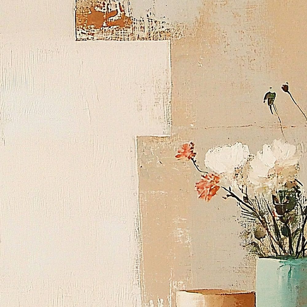 Details: Blumen, Vase, abstrakt, Minimalismus, beige, weiß, orange, elegant, ruhig, Gemälde