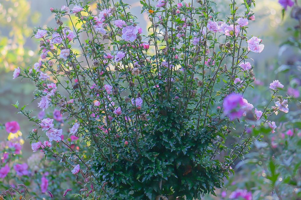 Blumengarten am Ende des Sommers, wo die Morgensonne über die in verschiedenen Farben leuchtenden Blumen scheint