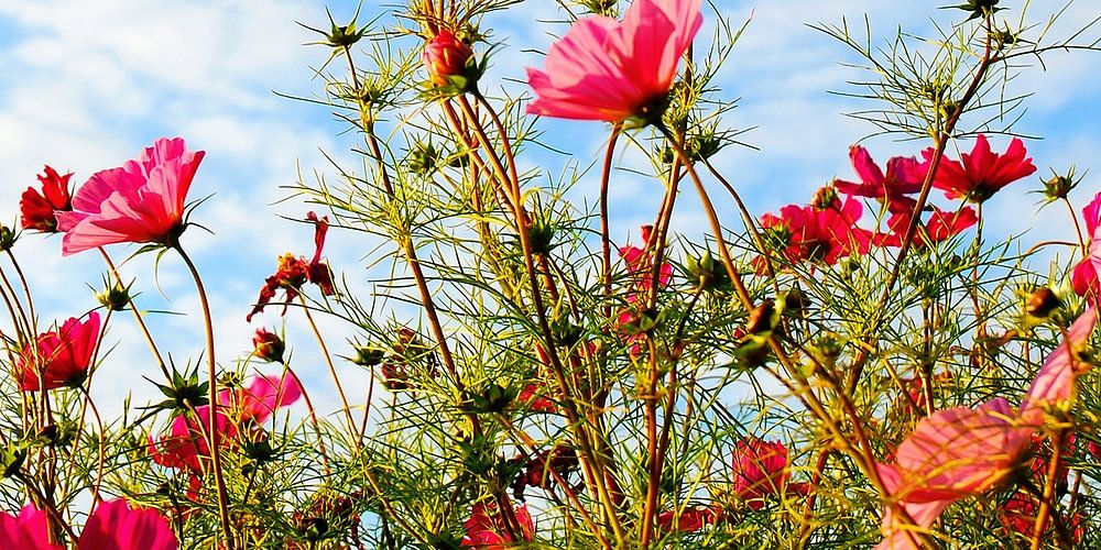 Blumenwiese, Pink Cosmea und Wolkenhimmel, Panorama