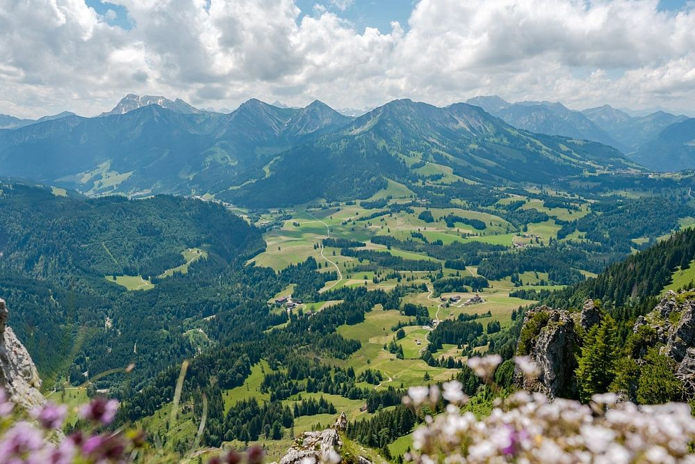 Blumige Aussicht vom Sorgschrofen auf das Oberjoch und die Allgäuer Alpen