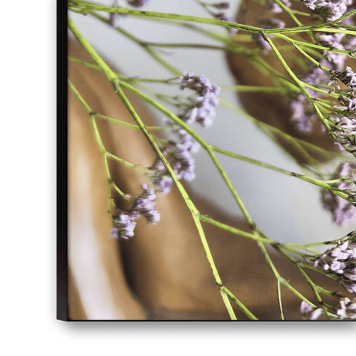 Dieses Kunstwerk fängt einen Moment der Stille und Meditation ein. Im Vordergrund sieht man zarte violette Blumen, die subtil verblassen, während im Hintergrund eine Holzskulptur einer menschlichen Figur zu sehen ist. Die Figur sitzt in einer nachdenklichen Pose, den Kopf auf die Hand gestützt, und strahlt ein Gefühl tiefer Kontemplation aus.