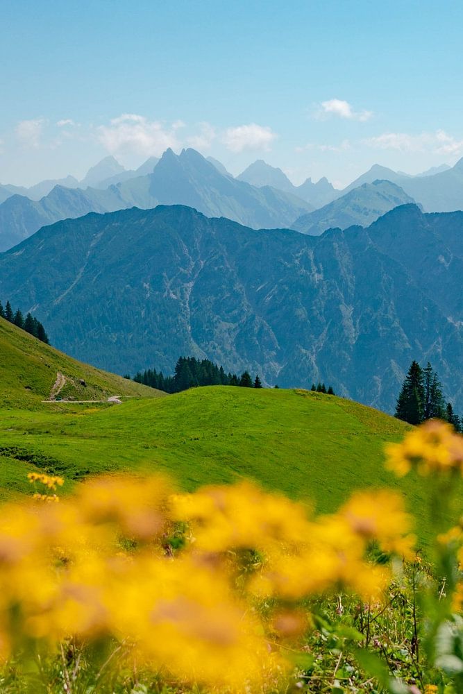 Blumiger Ausblick auf die Allgäuer Alpen vom Fellhorn