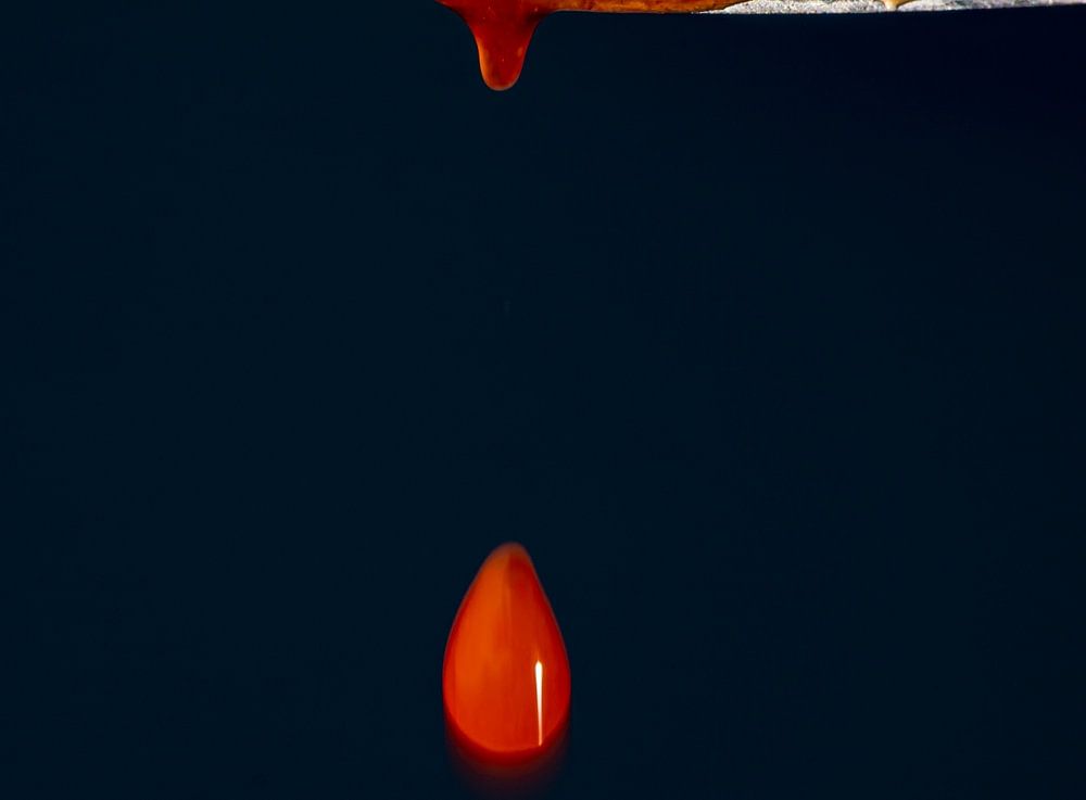 Ein Foto eines blutigen Messers, an dem Blutstropfen hängen und ein Blutstropfen vom Messer fällt