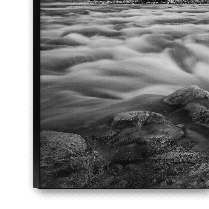 Das Foto; eine Schwarz-Weiß-Aufnahme am Abend von der Brücke, dem Fluss und einem kleinen Teil des Dorfes.