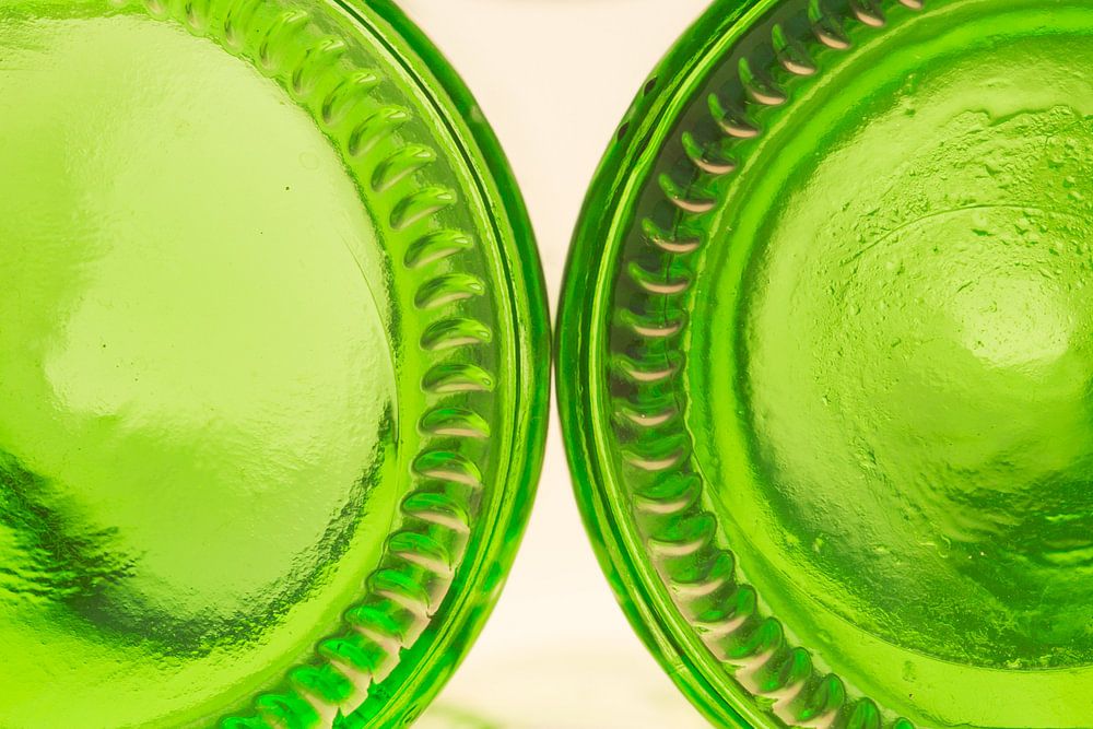 Close up van de bodems van een aantal flesjes van een bekend biermerk