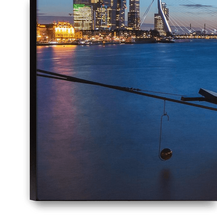 Die blaue Stunde nach Sonnenuntergang an der Skyline von Rotterdam auf Höhe der Boompjes.