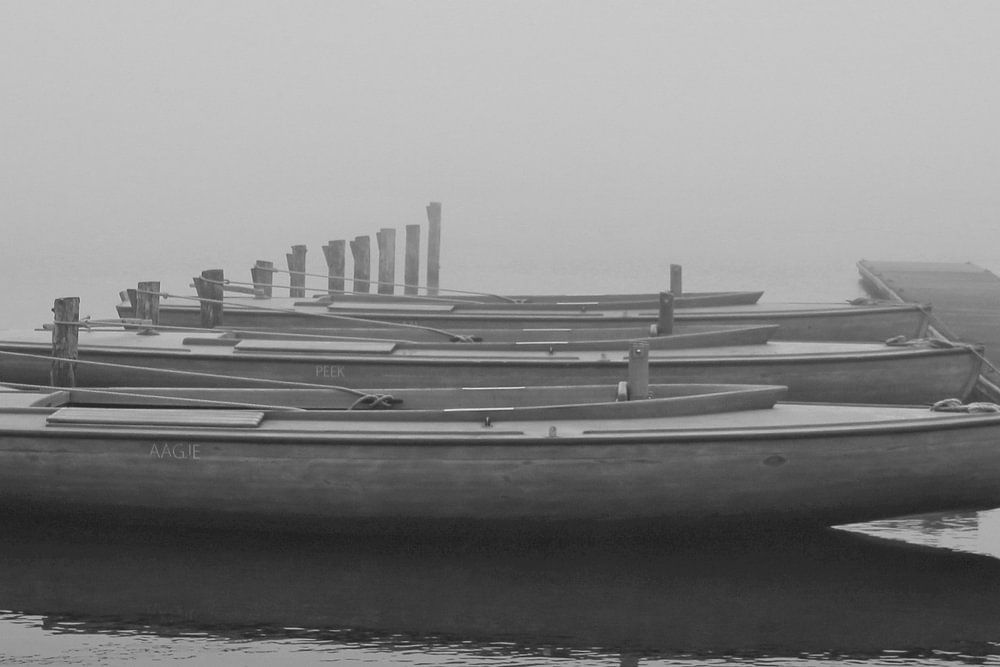 Boote am Steg auf dem Wasser im Nebel in schwarz-weiß dargestellt.