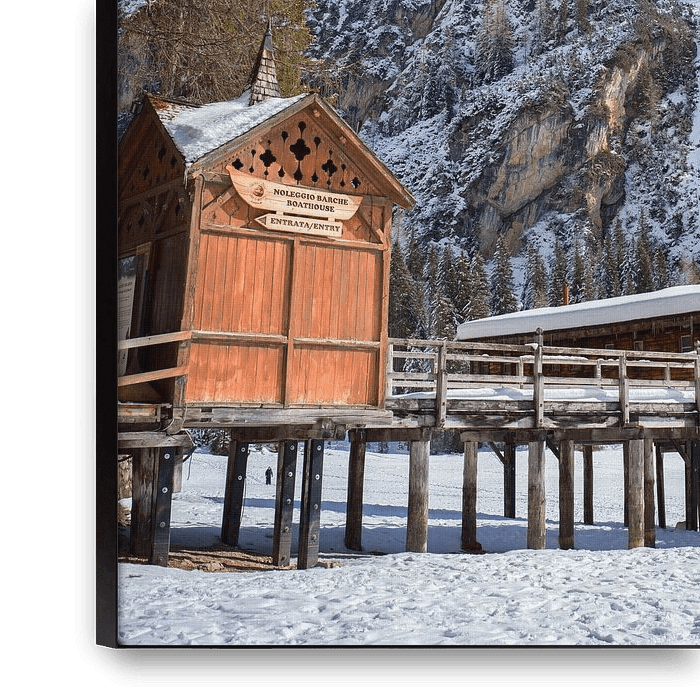 Bestelle dieses Landschafts-Wandbild Bootssteg am Pragser Wildsee von t.ART als Reproduktion auf Leinwand, Alu-Dibond, als Poster, Fototapete oder Acrylglasbild.