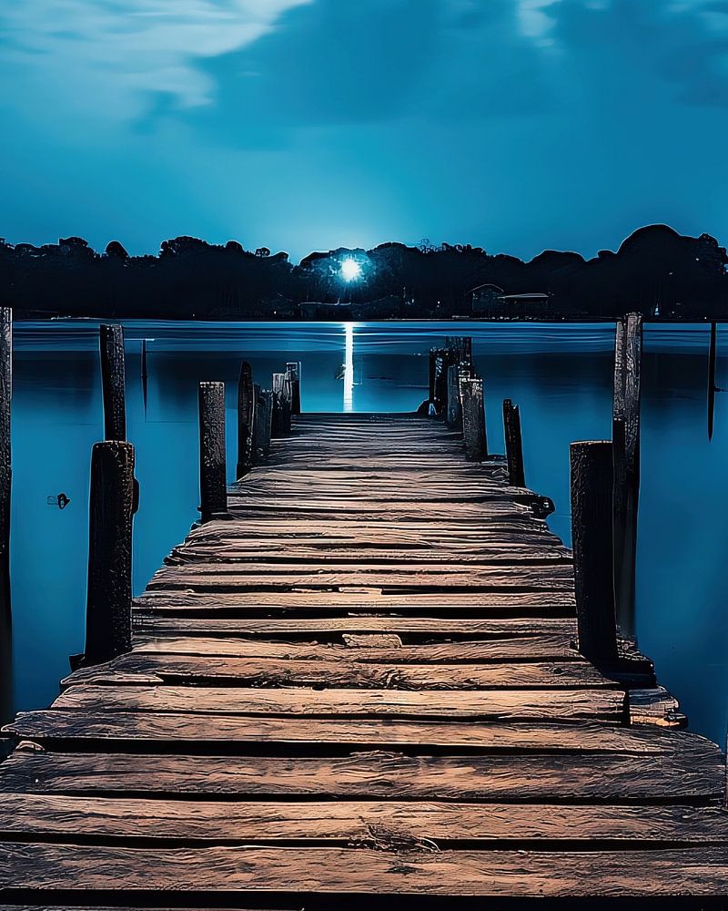 Bestelle dieses Landschafts-Wandbild Bootssteg in der Nacht von fernlichtsicht als Reproduktion auf Leinwand, Alu-Dibond, als Poster, Fototapete oder Acrylglasbild.