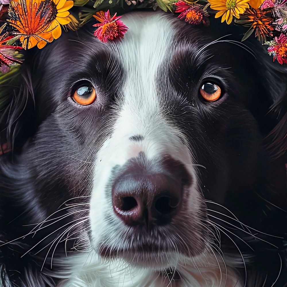 Border Collie mit Blumen aus einer Serie von Hunderassen mit Wildblumen, digital erstellt mit AI und Photoshop. Ein schöner Kontrast mit den bunten Blumen auf dem weichen Hintergrund.