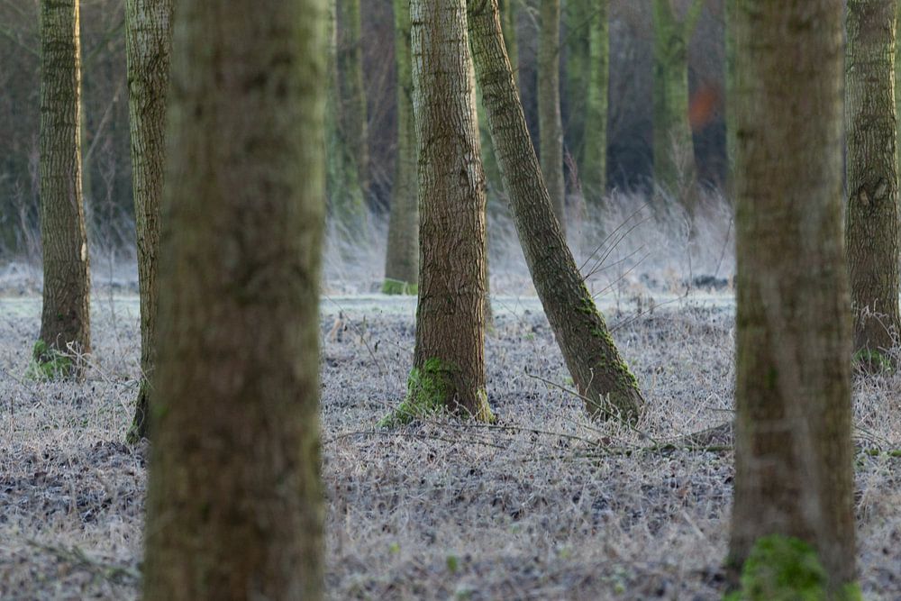 Doorkijkje langs boomstammen in bos Nieuw Wulven, de lage begroeiing wit van de rijp. Zichtlijn naar een afwijkende, kromme boomstam.