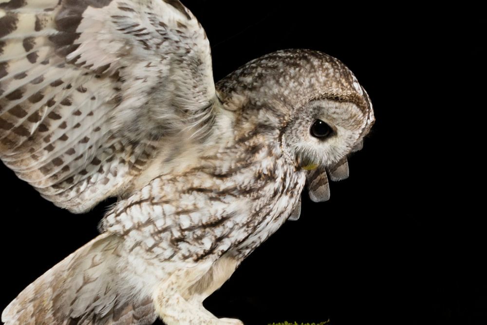 Bosuil (Strix aluco) in de nacht. Net geland met uitgestrekte vleugels.