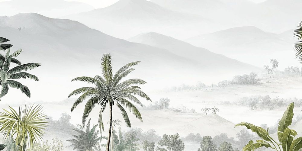 Verträumte botanische Tapete mit tropischen Pflanzen in sanften Grüntönen, ideal für einen ruhigen und natürlichen Einrichtungsstil