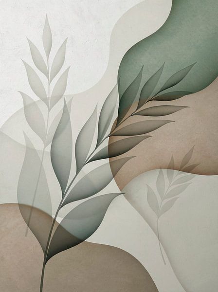 Abstrakte Formen und durchsichtige Zweige mit Blättern in ruhigen Farben