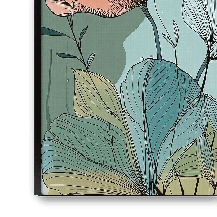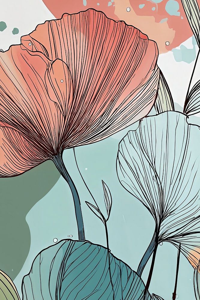 Eine botanische Illustration mit modernem Touch, bei der mohnähnliche Blüten und Blätter in sanften Pastelltönen von Koralle, Minze und Türkis vor einem hellen Hintergrund schweben. Die zarte Linienführung wird durch subtile Farbfelder und organische Formen verstärkt, was zu einer verträumten, zeitgenössischen Komposition mit beruhigender Wirkung führt.