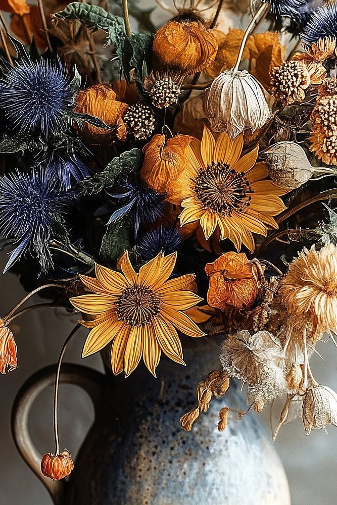 Eine attraktive Komposition, bei der eine rustikale Steingutvase mit einem üppigen Strauß aus blauen Disteln, orangefarbenen Sonnenblumen und Trockenblumen gefüllt ist. Die warmen Herbsttöne kontrastieren wunderbar mit den kühlen Blautönen, während frische Äpfel und alte Scheren auf dem Holztisch dem Ganzen einen authentischen, ländlichen Look verleihen.