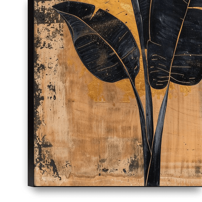 Abstrakte Silhouette einer tropischen Pflanze. Auf natürlichem beigem Hintergrund mit goldenen Details.