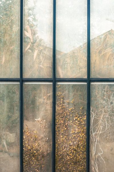 Dieses Werk fängt einen Blick durch Glas ein, bei dem sich Pflanzen und Spiegelungen innerhalb eines strukturierten Rasters überlagern.