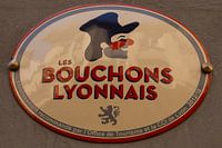 Bouchon Lyonnais Schild an der Wand eines Bouchon-Restaurants in Lyon, Frankreich