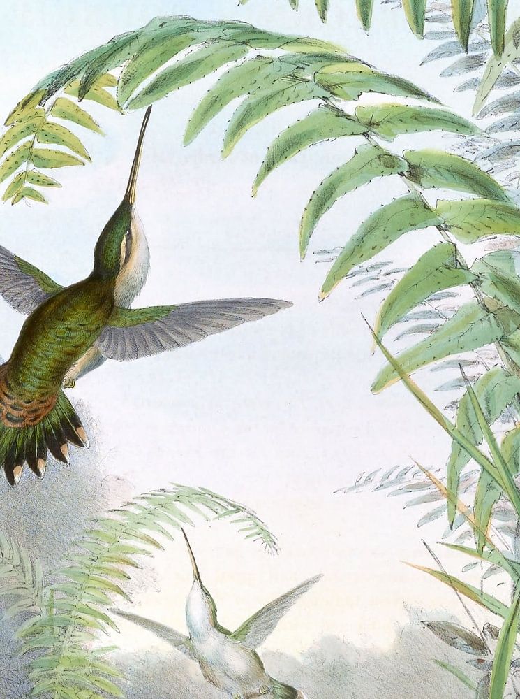Bourciers Einsiedler (Phaëthornis Bourcieri), John Gould Ich denke unter Oberfläche; in der Größe ist es viel kleiner als P. Superciliosus oder P. eurynome. Diese Illustration wurde in ihre ursprüngliche Lebendigkeit wiederhergestellt, indem die Farben verstärkt und unerwünschte Markierungen entfernt werden. Eine Monographie der Trochilidæ oder der Familie von Kolibris wurde zwischen 1849 und 1887 vom englischen Ornithologen John Gould veröffentlicht. Diese monumentale Arbeit zeigt und beschreibt alle bekannten Arten von Kolibris zu dieser Zeit - mit 418 lithografischen Platten und Informationen zu 537 Arten. "