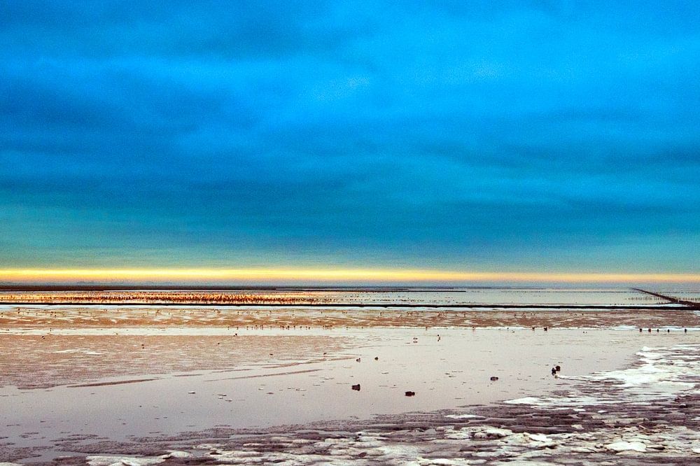 Gefrorenes Watt im Wattenmeer bei Holwerd in Friesland mit Enten und Gänsen im Winter