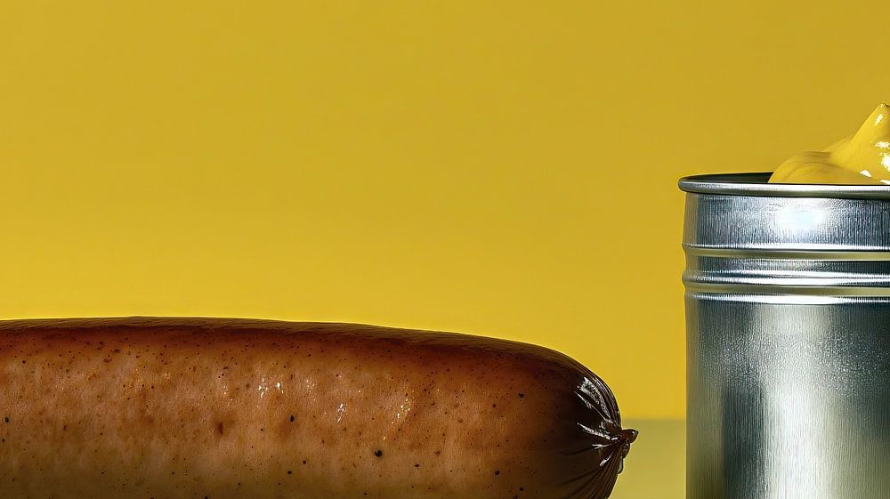Diese Szene zeigt eine ganze Wurst neben einer geöffneten Senftube auf einem lebhaft gelben Hintergrund. Die lebendige Gelbfarbe bildet einen kontrastreichen Rahmen für die appetitliche Wurst und die offene Senftube. Das Arrangement lädt den Betrachter ein, den köstlichen Genuss von Wurst und Senf zu erleben und die frische, lebendige Atmosphäre der Szene zu spüren.