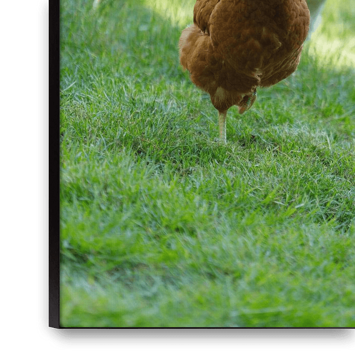 Bestelle das Foto Braune Henne, weißer Hahn und graue Henne im Gras von de-nue-pic als Reproduktion auf Leinwand, Alu-Dibond, als Poster, Fototapete oder Acrylglasbild.