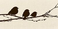 Silhouettenkomposition von drei Vögeln, die friedlich auf einem Ast sitzen, dargestellt vor einem neutralen Hintergrund aus Leinen. Die Vögel sind in tiefem Dunkelbraun gehalten, das fast schwarz wirkt, und stehen in starkem Kontrast zu dem hellen Hintergrund. So entsteht ein grafisches, fast ikonisches Bild.