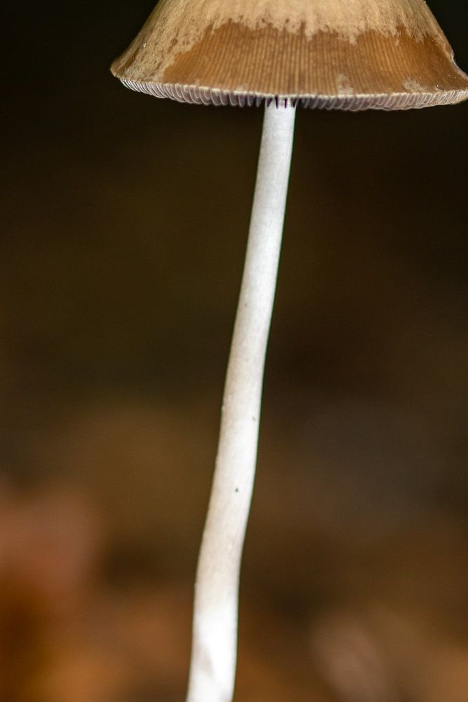 Ein einzelner beige-brauner Fransenpilz, der zwischen Herbstlaub wächst. Mit einem dunklen, dunstigen Hintergrund.