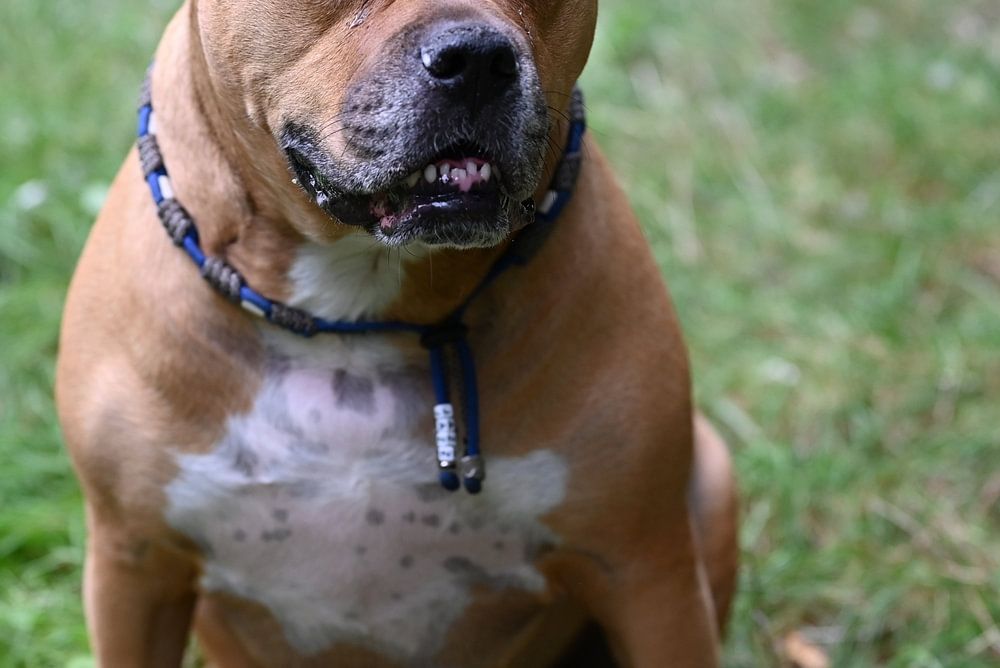 Brauner Stafford-Hund sitzt im Wald und schaut in die Kamera
