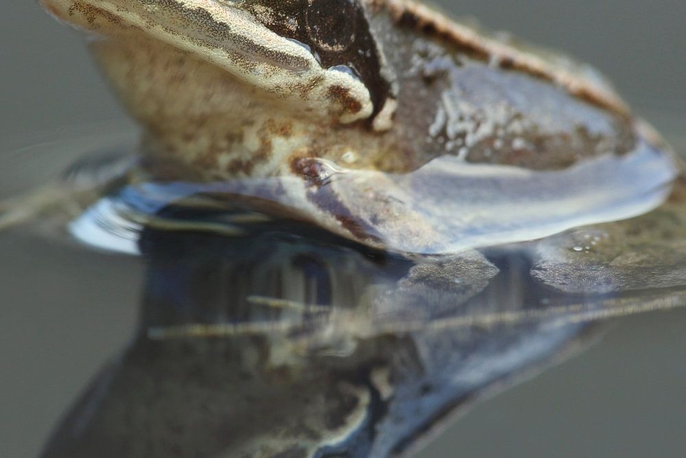 Ein Braunfrosch in einem flachen Teich. Der Braunfrosch ist eine der am weitesten verbreiteten Arten in Europa und kommt in sehr vielen Biotopen vor, darunter Wälder, Heidelandschaften, Grasland, unwegsames Gelände und Dünen. Dieser Frosch ist nur während der Fortpflanzung und des Winterschlafs an das Wasser gebunden und lebt außerhalb der Wintermonate und im zeitigen Frühjahr an Land.