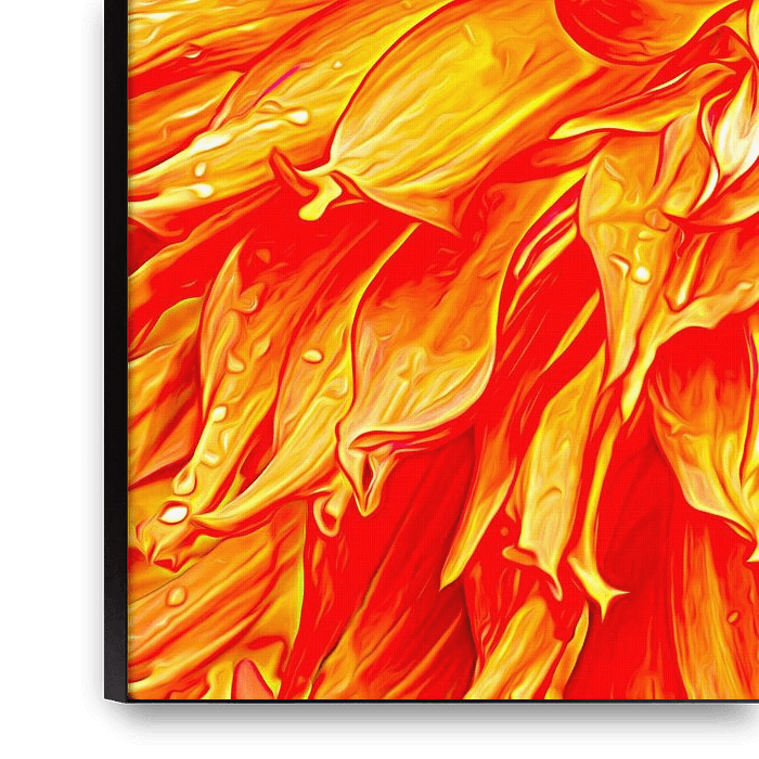 Digital verarbeitetes Bild einer Dahlienblüte. Das Originalfoto dieser schönen Blume mit ihren leuchtenden Farben sah bereits aus, als würde sie brennen. Die weitere Verarbeitung steigerte den Effekt. Die leuchtend gelben, orangefarbenen und roten Farben bringen Wärme in jedes Wohnzimmer!