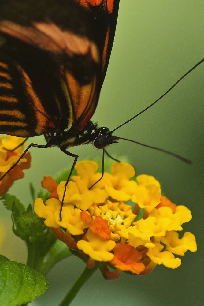 Nahaufnahme eines Briefträgerschmetterlings (Heliconius melpomene) auf gelber Blüte
