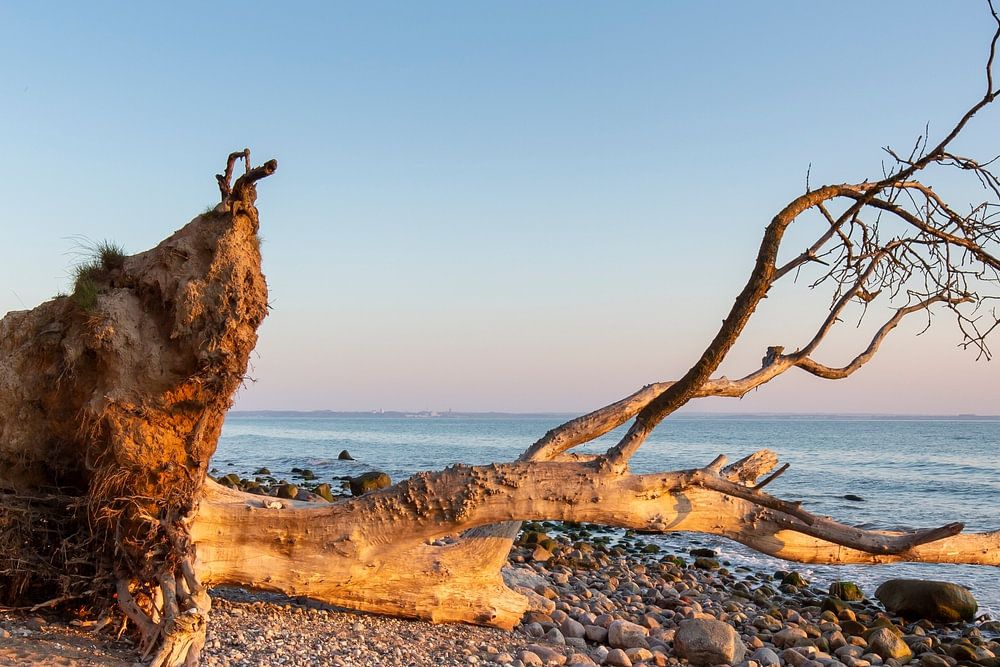 Toter Baum zum Sonnenaufgang am Brodtener Steilufer an der Ostsee, Schleswig-Holstein, Deutschland