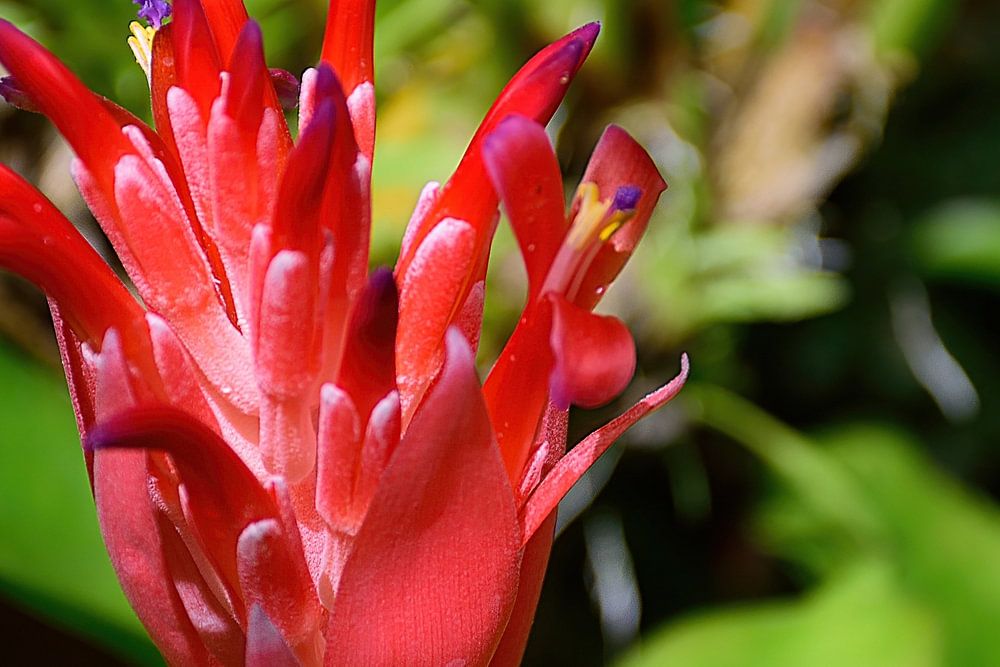 Diese blühende Bromelie gefiel uns bei einem Spaziergang durch den Garten des schlafenden Riesen in der Nähe der Stadt Nadi auf der Hauptinsel Fidschi. Der Garten beherbergt auf fast 20 Hektar mehr als tausend verschiedene Orchideenarten und noch mehr einheimische Blumen und Bäume.
