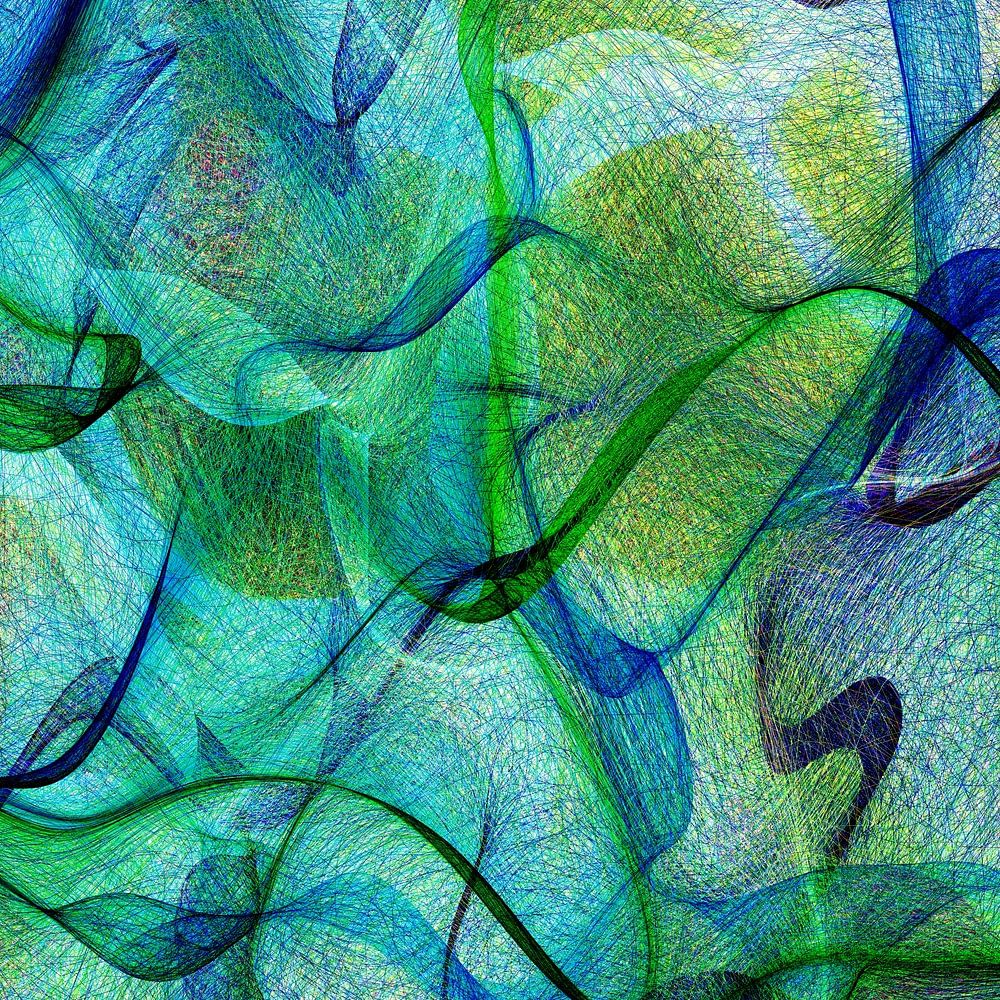 Abstrakte digitale Malerei mit verschlungenen Formen in mehreren Farben, die eine komplexe und faszinierende Landschaft schaffen.