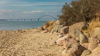 Dieses Werk zeigt eine klare, authentische Mittagsansicht der Fehmarnsundbrücke im März. Im Vordergrund ruhen mächtige, raue Findlinge auf dem trockenen Küstenstreifen. Diese eiszeitlichen Steine bilden einen kraftvollen Kontrast zum feinen, hellen Strand und dem ruhigen Wasser der Ostsee dahinter. Am Horizont spannt sich die markante…