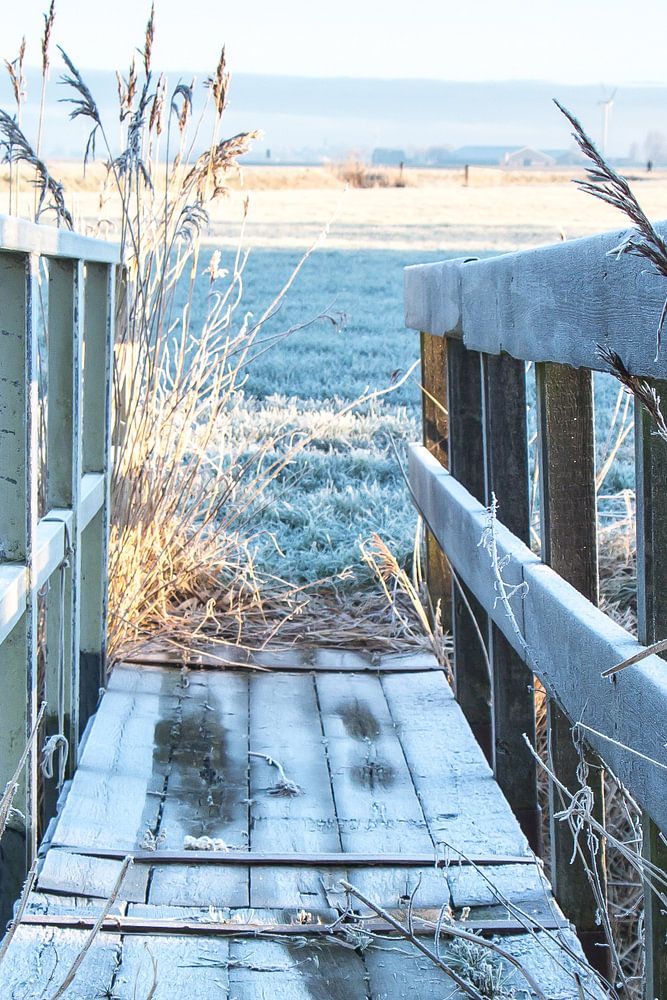 Es ist ruhig über den Feldern. Eine gefrorene Holzbrücke führt in die Stille.