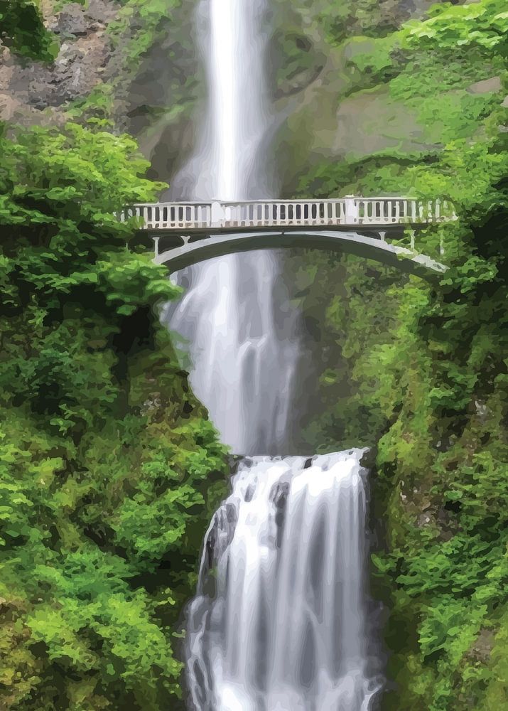 Entdecken Sie die bezaubernde Schönheit der Natur mit diesem atemberaubenden digitalen Gemälde eines kaskadenartigen Wasserfalls, der von einer historischen Steinbrücke eingerahmt wird. Das üppige Grün und das kristallklare Wasser schaffen eine heitere und einladende Atmosphäre. Perfekt für alle, die Ruhe und natürliche Schönheit suchen.