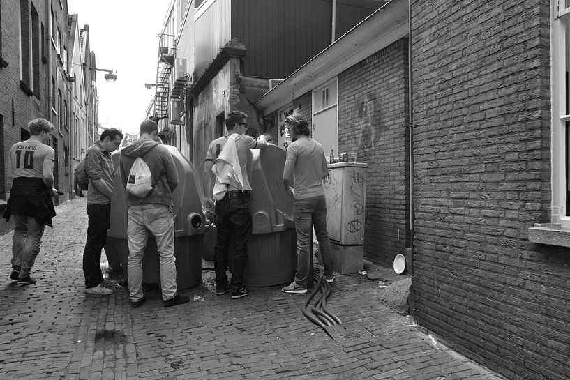 Bruderschaftliches Pinkeln, Straßenfotografie, Schwarz-Weiß