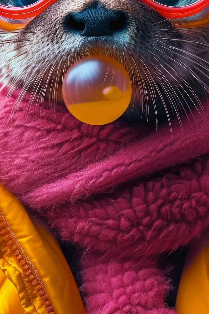 Mit seinen großen, ausdrucksstarken Augen, die durch die runden, orange gerahmten Brillengläser blicken, strahlt der Otter ein Gefühl der Verwunderung und Verspieltheit aus. Der fröhliche Otter ist in einen leuchtend gelben Wintermantel gekleidet, der in starkem Kontrast zu dem weichen rosa Schal steht, der seinen Hals wärmt. An seiner Schnauze hängt eine leuchtende, fast durchscheinende Kaugummiblase, die dem Bild einen verspielten und jugendlichen Charakter verleiht.