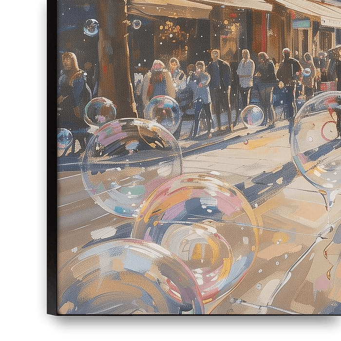 "Bubbles in Paris" fängt die pulsierende Energie einer belebten Straßenszene vor der majestätischen Sacré-Cœur in Paris ein. Als Künstlerin wurde ich von der Dynamik der französischen Hauptstadt inspiriert, wo das geschäftige Treiben der Großstadt auf eine verträumte Atmosphäre trifft.