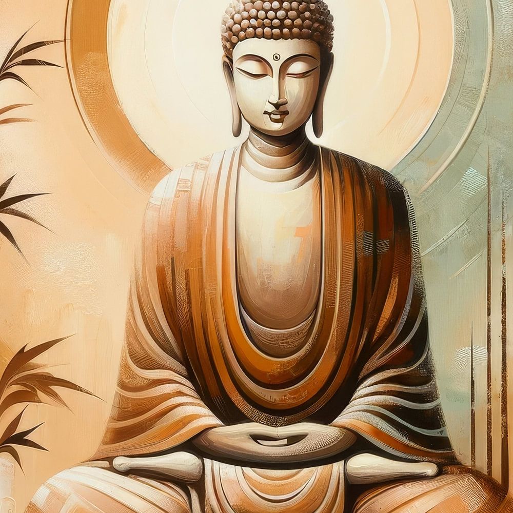 Dieses Gemälde zeigt den Buddha in tiefer Meditationshaltung, umgeben von einem ruhigen, in warmen Erdtönen gehaltenen Hintergrund. Seine Gesichtszüge strahlen Ruhe und Frieden aus, während seine geschlossenen Augen auf einen Zustand tiefer Kontemplation hindeuten. Die subtilen Farbverläufe von Braun, Beige und Grün symbolisieren seine Verbundenheit mit der Natur und der irdischen Welt. Das Kunstwerk spiegelt die Essenz von Erleuchtung und innerer Harmonie wider, eingefangen in beruhigenden Farben, die den Betrachter zum Nachdenken einladen