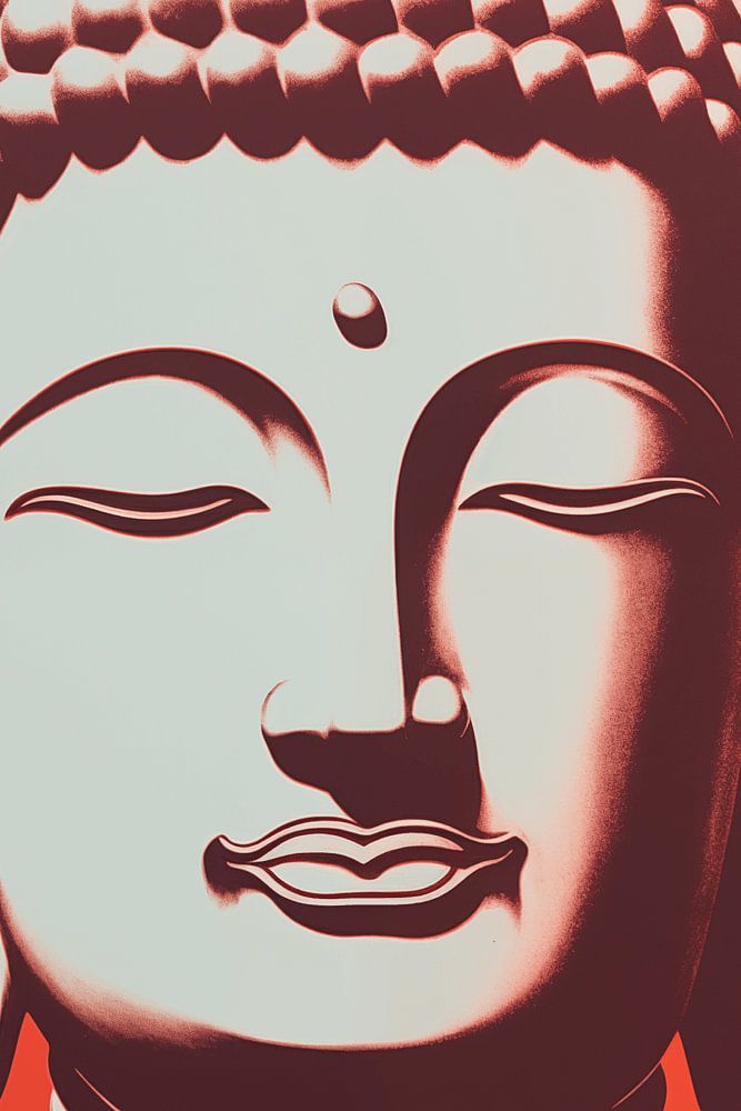 Dies ist ein modernes grafisches Porträt eines Buddhas, das in einem starken Kontrast von Rot und Weiß dargestellt ist. Der Stil ist einfach, aber kraftvoll, mit einem Pop-Art-Gefühl, das sowohl den Geist von Andy Warhol als auch traditionelle buddhistische Kunst hervorruft. Das Kunstwerk strahlt ein Gefühl von Frieden und Meditation aus, hat aber dennoch eine starke visuelle Wirkung.