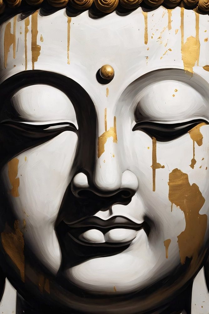 Dieses faszinierende Kunstwerk fängt den ruhigen Blick eines Buddhas mit einer modernen Wendung ein. Gold- und Bronzetropfen fließen nach unten und erzeugen eine kontrastreiche Dynamik, die sowohl Gelassenheit als auch Bewegung ausdrückt. Der künstlerische Ausdruck der Vergänglichkeit und der Schönheit der Unvollkommenheit ist wunderschön wiedergegeben, während die Verwendung von Gold einen Reichtum hinzufügt, der der zeitgenössischen Wertschätzung klassischer Themen entspricht. Dieses Werk ist eine auffällige Ergänzung für jeden Raum, vom minimalistischen Wohnzimmer bis zum stilvollen Büro, und wird unter Kunstliebhabern sicher für Gesprächsstoff sorgen.