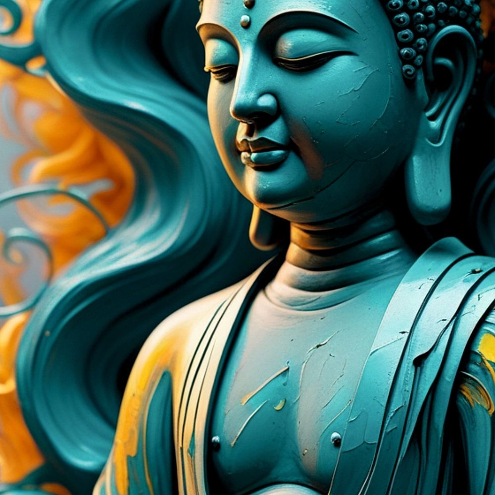 Das Bild zeigt eine eindrucksvolle, künstlerisch gestaltete Buddha-Darstellung, die durch ihre kräftigen Farben und fließenden Formen eine besondere visuelle Wirkung entfaltet. Die Figur des Buddha sitzt in traditioneller Meditationshaltung mit verschränkten Beinen und den Händen in der Dhyana-Mudra. Der Gesichtsausdruck ist friedvoll und in sich gekehrt, die Augen geschlossen – ein Symbol für innere Ruhe und spirituelle Tiefe.