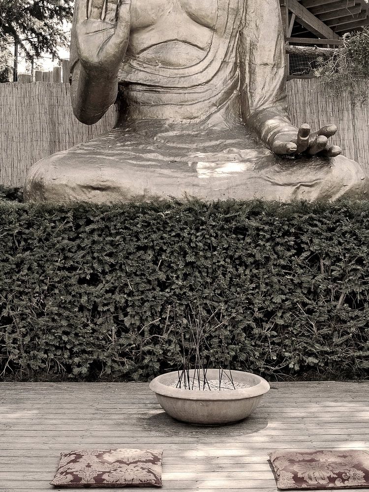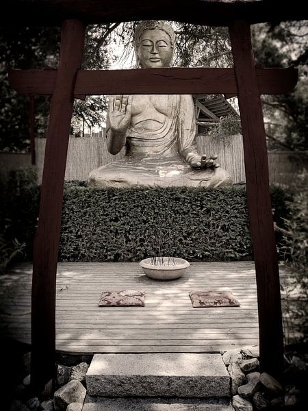 Platz zur Andacht mit einer Buddhastatue in einem Garten hinter einem roten japanischem Portal in Österreich