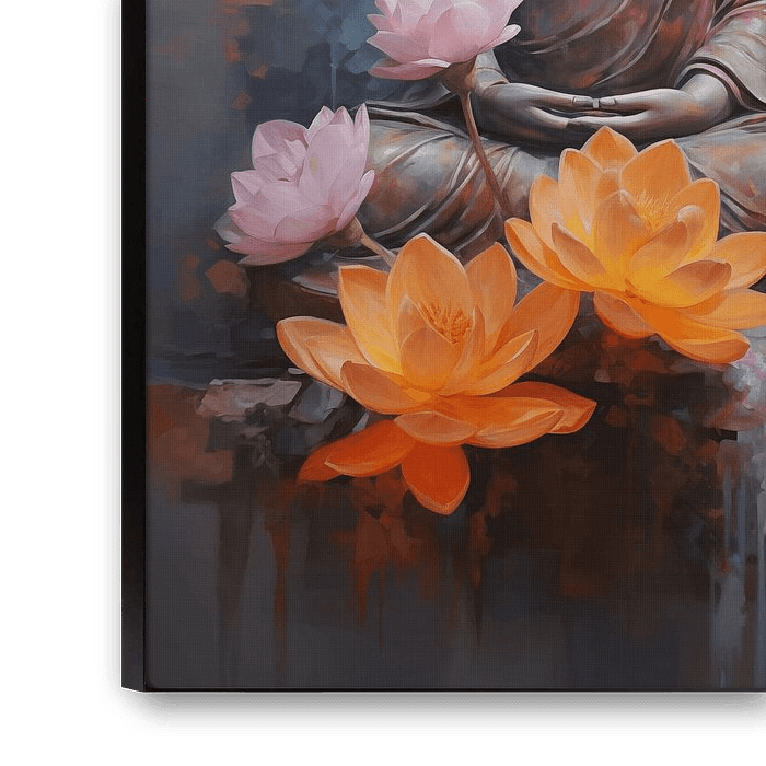 Der Kunststil ist eine moderne Mischung aus Realismus und Impressionismus, wobei sich die ätherische Qualität des Buddhas und der Blumen deutlich von dem abstrakten Hintergrund abhebt. Das Werk strahlt eine Atmosphäre ruhiger Reflexion und spiritueller Tiefe aus.