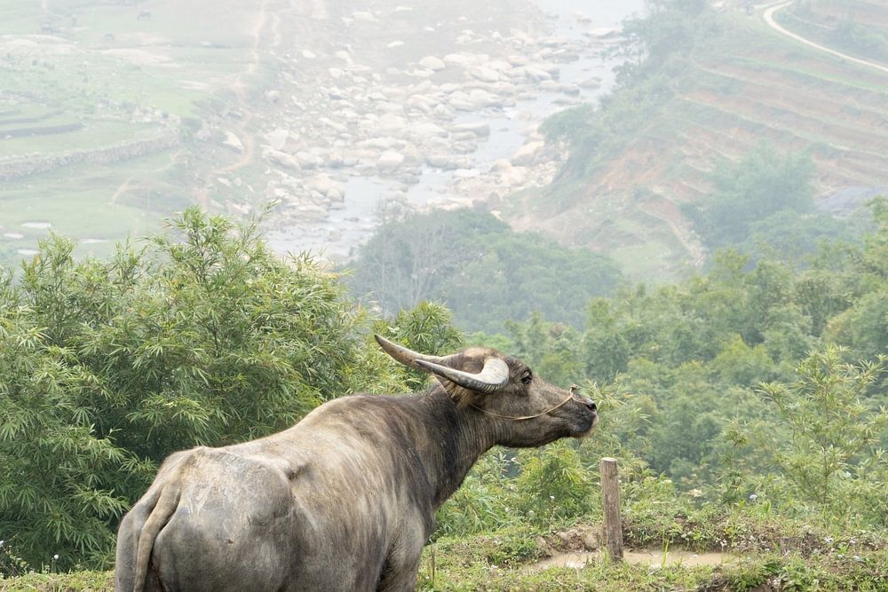Das Bild zeigt den Büffel in seinem Element. In den Bergen, mit seinen Pfoten in den schlammigen Reisfeldern.