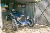 Bugatti Type 35, klassischer Rennwagen, ausgestellt in einem alten Schuppen mit Automobilia im Hintergrund. Der Bugatti Type 35 war zu seiner Zeit ein sehr erfolgreicher Rennwagen und wurde in verschiedenen Versionen hergestellt.